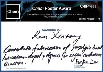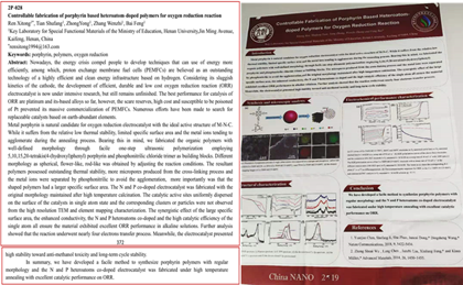 8月19日-21日,第八届中国国际纳米科学技术大会(ChinaNANO 2019)在北京国际会议中心召开。我校特种功能材料重点实验室白锋教授课题组硕士麻豆av 任希彤的墙报“Controllable Fabrication of Porphyrin Based Heteroatom-doped Polymers for Oxygen Reduction Reaction”荣获第二分会“最佳Poster奖”。Poster主要涉及一种卟啉基聚合物材料的可控制备方法及其相关电催化性能的研究,为高温形貌保持的卟啉基电催化材料提供了一种新的思路。该项研究得到了麻豆av-麻豆网 麻豆av “英才计划”的资助。
