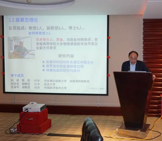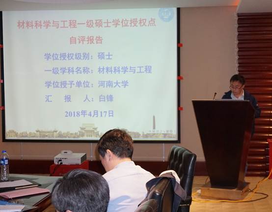 院长顾玉宗代表物理学学位点作自评报告。特种功能材料重点实验室副主任白锋代表材料科学与工程学位点作自评报告。首先,两人对本学科的发展历史与现状,主要学科方向的特色、优势及发展前景作了简要概述;随后,按照《评估指标体系》3个一级指标和17个二级指标,逐项汇报了培养目标、学位标准、师资队伍、科学研究、人才培养等方面的具体情况;最后,分析了本学位点存在的问题和不足,提出了改进提升计划。