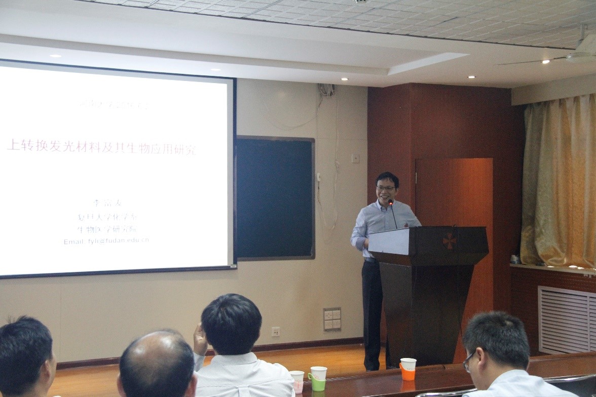 李富友教授以现代医学成像技术的发展历史为切入点展开了对荧光成像的讨论。李教授首先介绍了荧光成像在基础生物学的设计与应用,并指出荧光生物成像是以探针的荧光信号进行示踪,可实现从细胞到组织层次的活体显像;在动物活体成像中,生物样品的自发荧光干扰非常严重,因此设计新型荧光探针依然是一项挑战。随后介绍了其课题组的研究方向及取得的科研成果,目前李教授课题组利用稀土材料的独特发光性质,合成了多种水溶性且表面功能化的稀土上转换发光纳米材料,发展了激光扫描上转换发光显微镜和上转换发光活体成像系统,实现活细胞和小动物活体靶向成像。设计合成了高效的上转换发光纳米材料,并将其用于化学传感与生物成像领域。