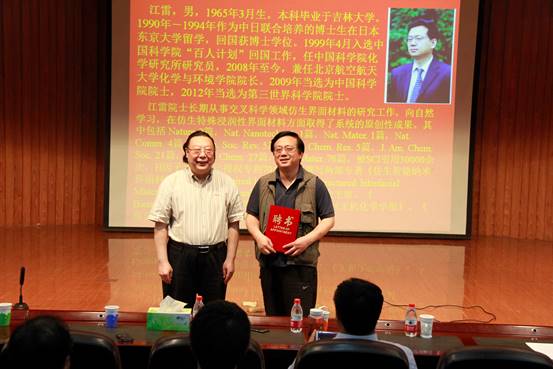 报告。江雷院士用幽默诙谐的语言、丰富多彩的例证与大家分享了自己二十多年来在科研思想、科研选题、科研方法、科研合作和论文撰写方面的感悟,现场气氛热烈,频频响起热烈的掌声和喝彩声。