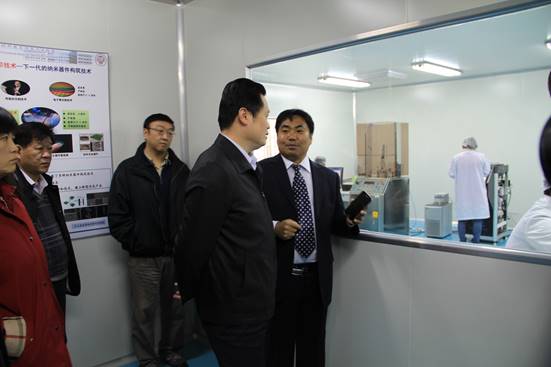 随后,贾厅长一行实地考察了一楼的QLED新型发光显示技术的实验场所和部分仪器设备。在透射电镜室、扫描电镜室,贾厅长详细询问了设备的功能、型号、价值,以及设备的使用情况。在纳米压印室,杜祖亮详细介绍了实验室最近几年组建起来的纳米压印技术、原子层技术和喷墨打印技术。他说,该实验系统居于国际先进水平,可以大面积、低成本的制备纳米精度的图案,是发展纳米器件的关键技术。实验室利用这些技术平台着重开展两个方面的工作,一是新型薄膜麻豆av方面的研究,主要目标是发展后硅时代的光伏技术;二是量子点发光二极管(QLED)的研究,研发下一代照明和显示技术。贾厅长仔细询问了纳米压印、喷墨打印技术的原理、主要功能和性能指标,杜祖亮教授对厅领导关心的问题一一进行回答。