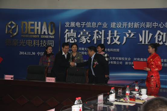 特种功能材料重点实验室、华为公司、中国人民大学河南校友会、市政合集团分别与开封德豪光电科技园举行入驻及合作签字仪式。