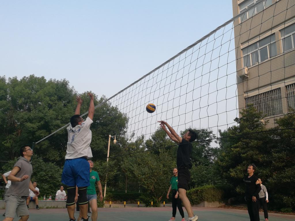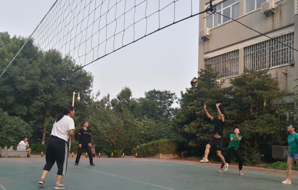 后面的排球场地开展了一次生动激烈的排球友谊赛。