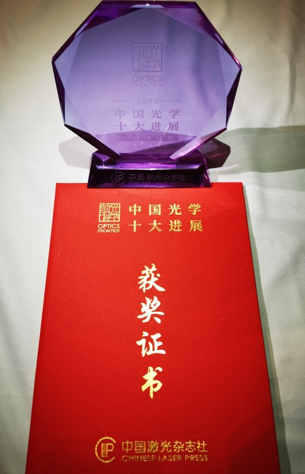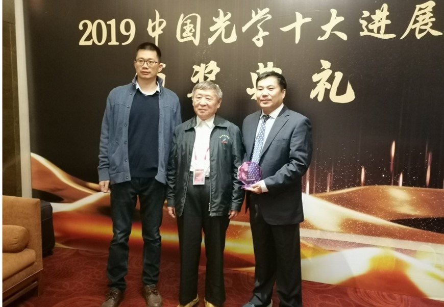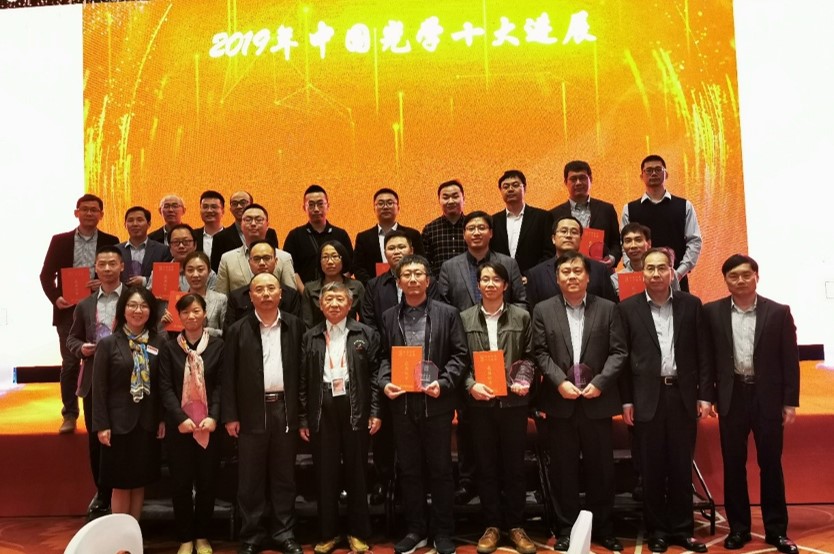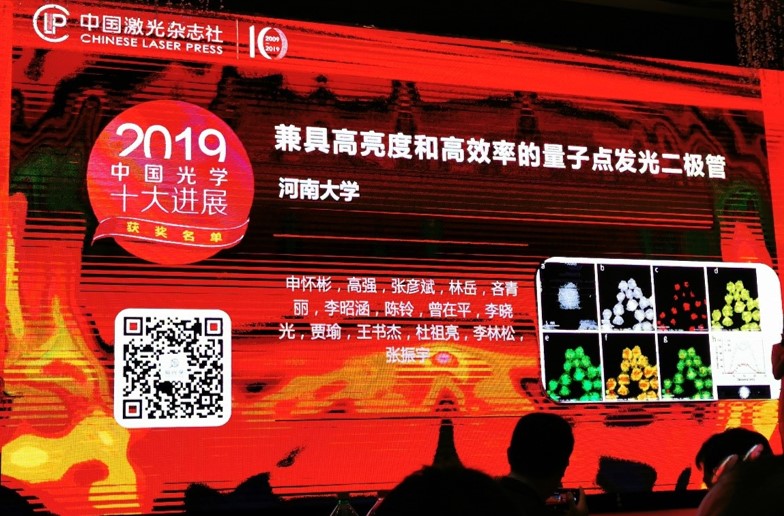 申怀彬教授、李林松教授、杜祖亮教授团队与中国科学技术大学张振宇教授团队合作取得的成果——“兼具高亮度和高效率的量子点发光二极管”—— 获评2019年度中国光学十大进展(基础研究类)。评选委员会主席范滇元院士等向获奖代表颁发了奖杯和证书。
